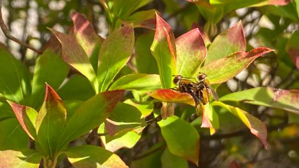 ドウダンツツジに留まったところで馬乗りからこの体勢になりました。