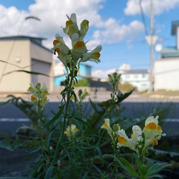 海岸付近でもないのに街路樹下にウンラン。画像検索する。外来種ホソバウンランだ。 -