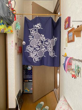廊下を通るたび父が覗きにやって来てウザいので、突っ張り棒&カーテンクリップ&風呂敷でのれんを付けてる。まいど!と隙間から顔を出す父。わしのベッドで寝てるネコを起こしてムリヤリ伸びさせる猫好き。