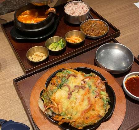 イオン苫小牧にできた韓国料理店チャンチの海鮮チヂミ。コチュジャン付けないと薄味。ちゃんと美味、1,300円/(^高^)\