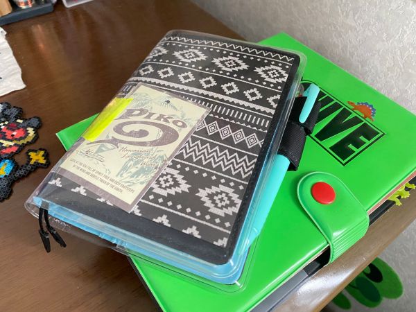 下のグリーンのはこれまで使っていた6リングバインダー手帳です。でかいこれのトラッカーページを机に広げっぱなしにしていた。今後は文庫本サイズのほぼ日を使うので机が広くなります。