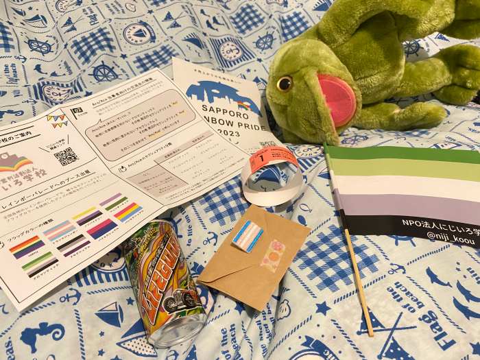 最初に見たブースでトランスワッペン(¥400)を買って、おまけのフラッグはアロマンティックを選びました。なにげに紙と串製フラッグ気に入ってずっと持ち歩いてた。もっとブース見る予定だったのに見られなかった。