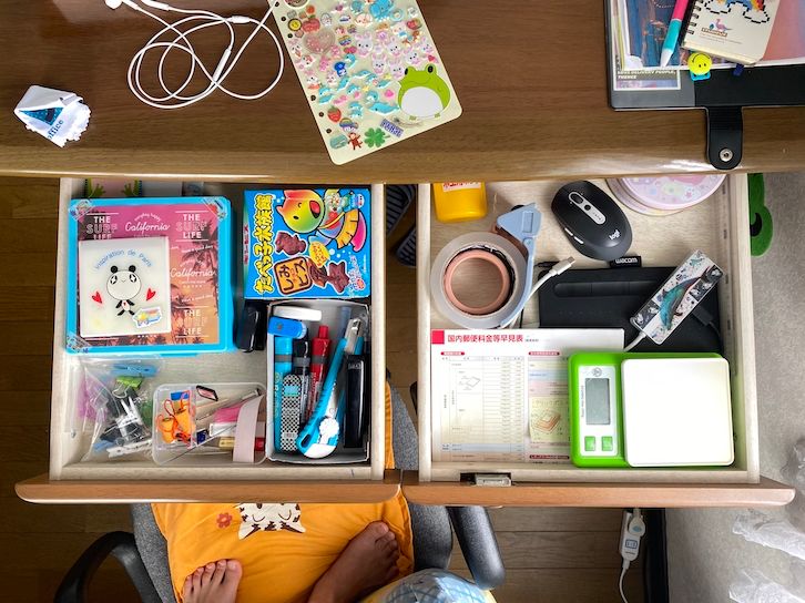 上段に使用頻度の低い文房具やステッカー、キャンドル。