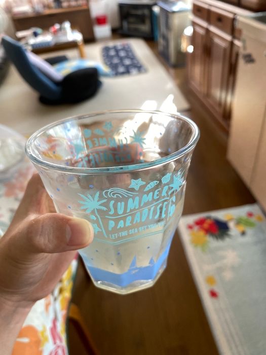 炭酸レモンジュース。このグラスは全体に星がプリントされてよくできている。ピンクバージョンと共にお気に入りですよ。今ダイソー見てもない。買っておいてよかったです。