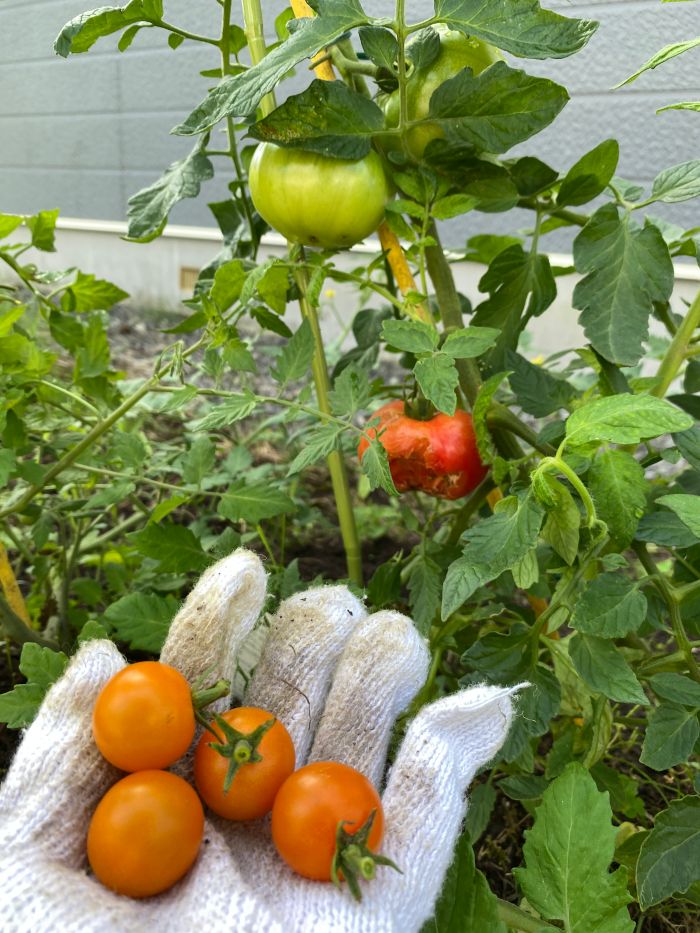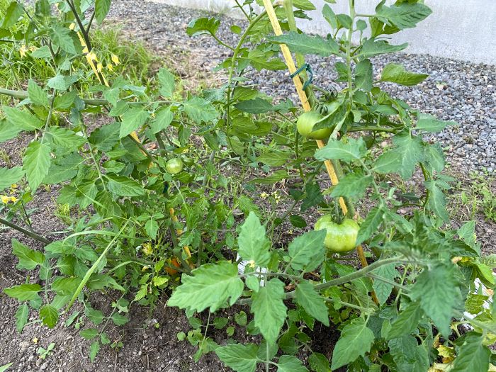 トマトは不安になり大玉のみ、茂った茎を切った。