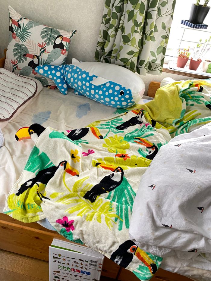 汗をかくのでタオルケットとシーツのみ早め(2週ぶり)に替えた。