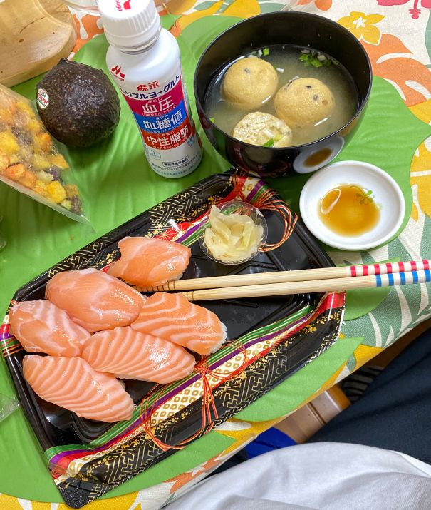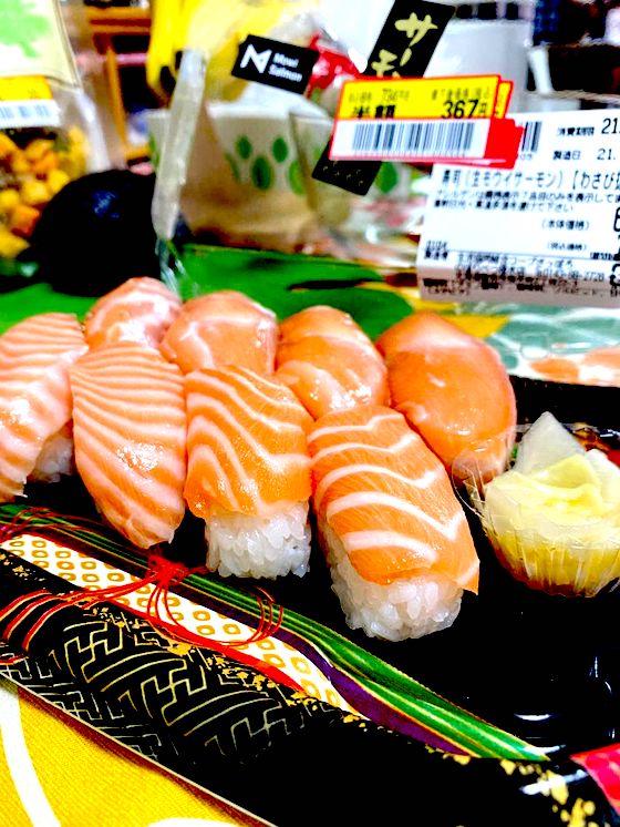 普段食べるのは安い刺身と惣菜コーナーの安い寿司ばかりですから、美しいボーダーのサーモンなんてさぞかし美味しいことでしょう。