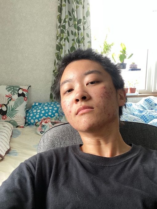 すぐ後ろにベッドがあり生活感が醸し出される。枕がニキビの血で汚れる。