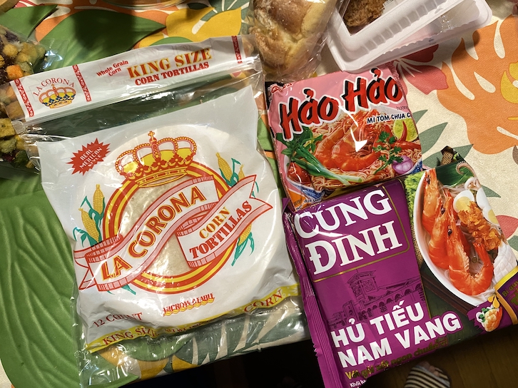 カルディでアメリカ冷凍コーントルティーヤと、100円以下のベトナムの即席袋麺2つ。