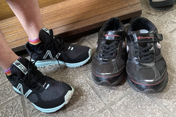 右は別居ばあちゃんからクリスマスにもらって8年履き続けた真っ黒チャンピオンスニーカー。マジックテープベルト。中底がぼろぼろに。