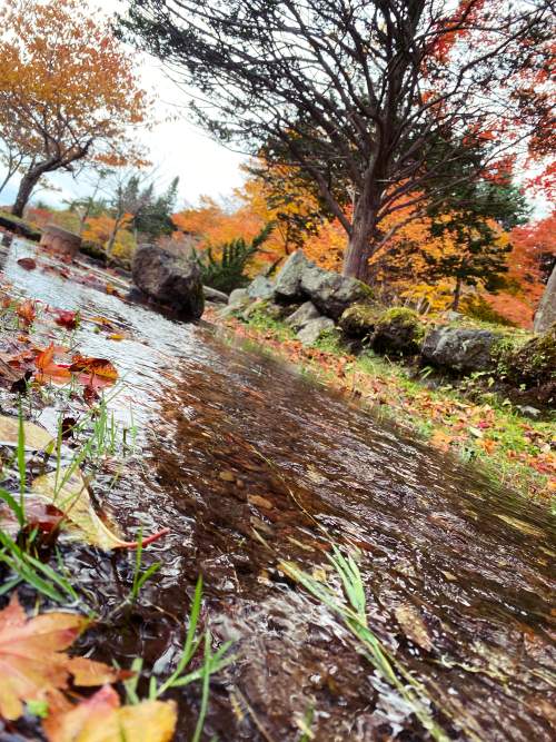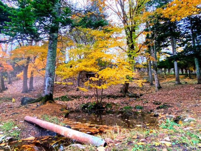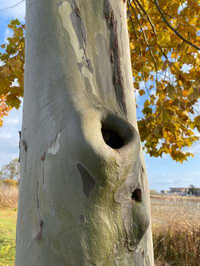 カエデさんの下を歩いたらカエデさんの葉が頭に落ちてきました。すべっすべの幹にトイレみたいな穴がありました。