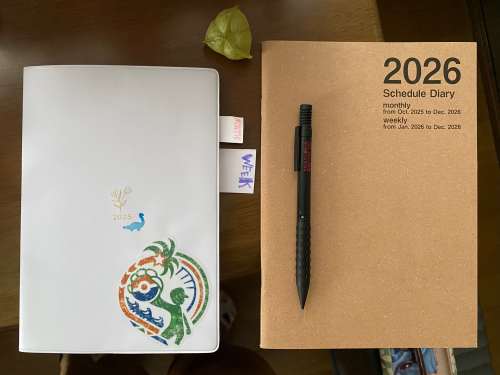 左のは今年使ってるカバー付きダイソー330円。右ページが方眼フリースペースになってて落書きできました。