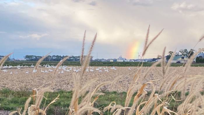 その川の近くの農場に鉄砲持った恐ろしいかかしが立ってた。