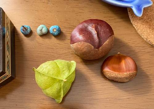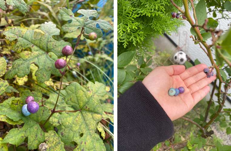 右は放置された隣の庭のブルーベリーの木といっしょに撮ったノブドウ。
