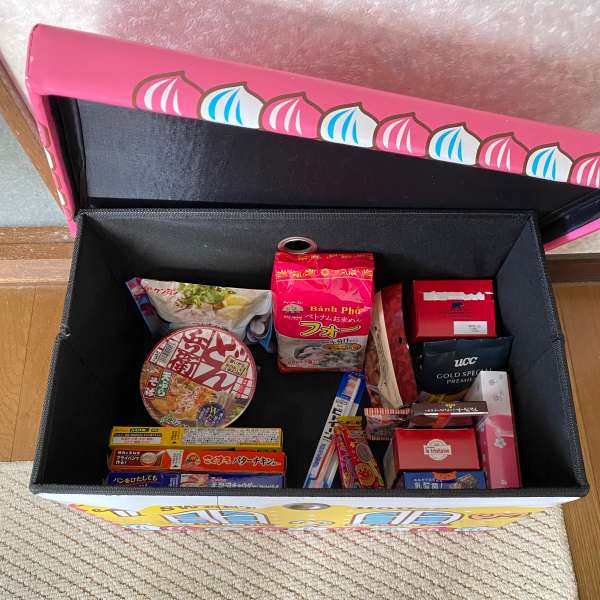 自分専用食料備蓄庫を毛布が入ってたボックスに移動。どこにでも入りたがるルルが側面の穴を覗いて手を入れようとしていた。