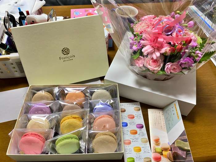 社長からは花と3,000円以上するマカロン12個入をもらって帰ってきてくれたよ。 -