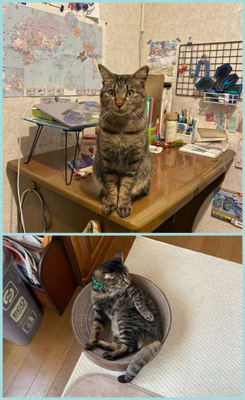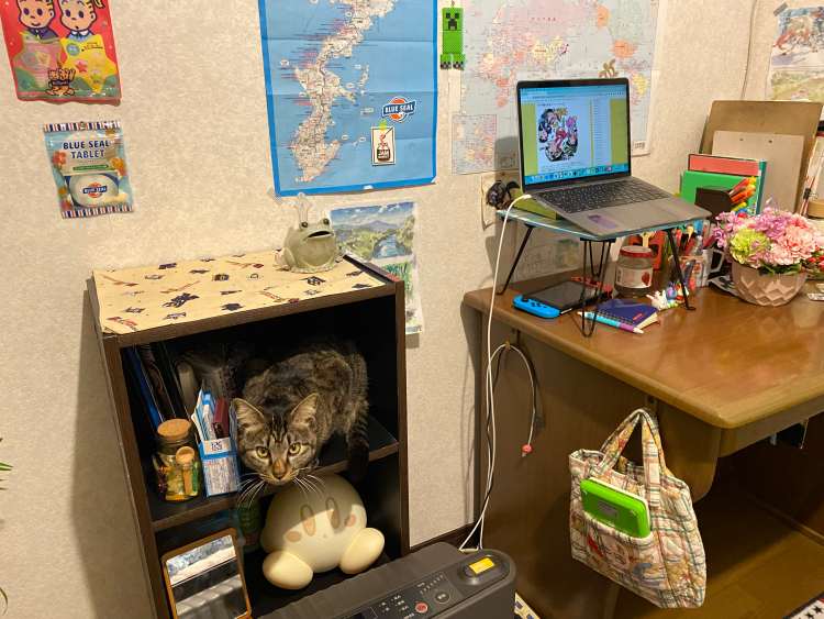 パソコンに向かう時、絵を描く時、構ってくれと机に乗って邪魔してくる。昼間は兄弟の部屋のクローゼットに隠れて寝て、自分が夜寝る時にはいい塩梅に来ないけどもうちょっと昼間も一人にさせてほしい。日課の運動がしづらいし。まあ2歳を過ぎれば今より一匹を好むようになると希望を持とう…まだ子猫の心なんだ。