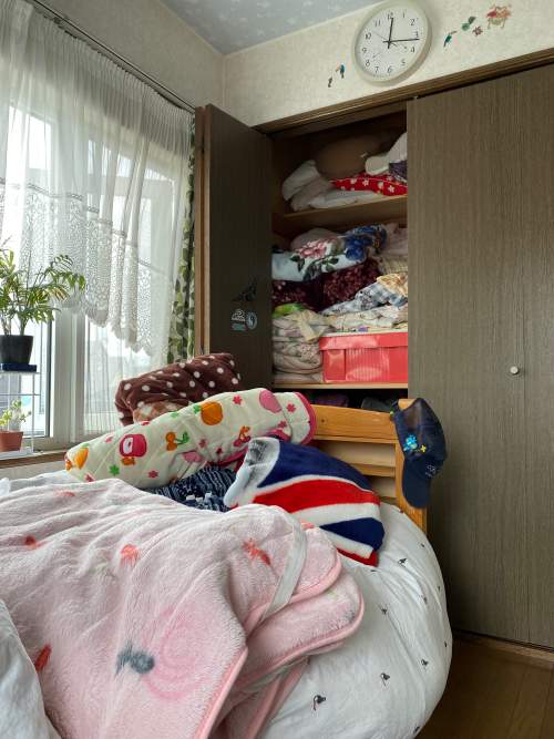 自室に余分な量の家族の寝具。
