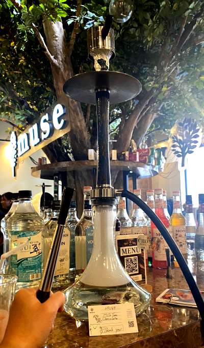 ミルクティー強めのチョコレート味ブレンドシーシャ1台。タバコの風味ゼロ。むせないし美味い、本当にミルクティーチョコ味。いろんな味試したくてハマりそうで危ない。数回吸ってクラクラきた、このダルさでクセになれない。酒頼まなくてよかった。
