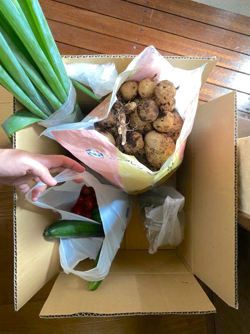 もらった野菜。ミニトマトもある。ジャガイモと大葉はとれたて。