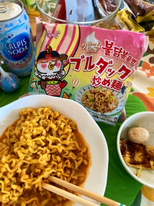 世界中のmukbangerが食べているSAMYANGブルダック炒め麺。トライアルで3種見つけたうち最も辛くなさそうなクリームカルボ。ホチも幸せそう。