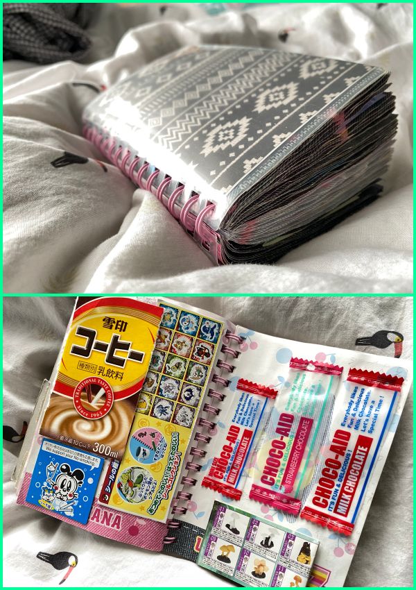 食品や玩具のパッケージなどを貼るコレクションノート。幼い頃から持っている。