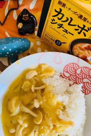 カルボシチューライス。ニクの代わりに焼き麩を入れました。炒め物はマジで水炒めで十分。ブロッコリーは油炒めが美味しい -