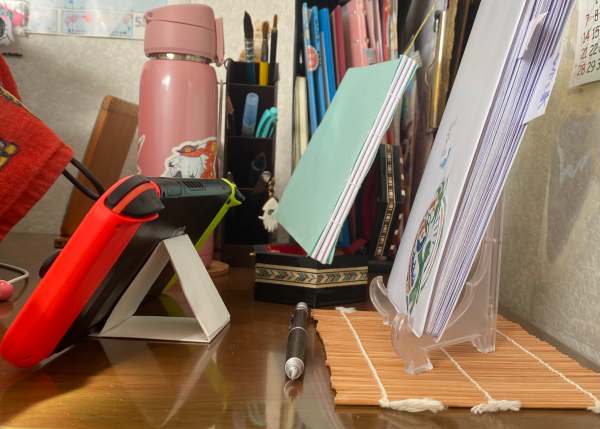 家にあるものがノートや機械のスタンドに適してるか試してるところだね。Switch乗せてるのは折り紙A4コピー用紙スマホスタンド。三角構造でしっかり支えてくれます。紙は偉大!汚れたりふやけたり。簡単楽しいよ。作り方はyoutubeなどで検索しよう。