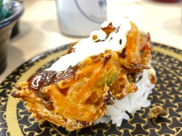 はま寿司でマヨかき揚げ寿司と、エビ天寿司、マヨ炙りとろサーモン寿司、まだち軍艦、10円あおさ味噌汁を。クーポンでいつも100円引きの汁物を飲めば多く食べすぎずに済む。自分のお代は大体600円しないでおなかポンポンになり帰れる。