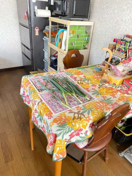 畑に白い部分を植えて育てたネギを収穫。