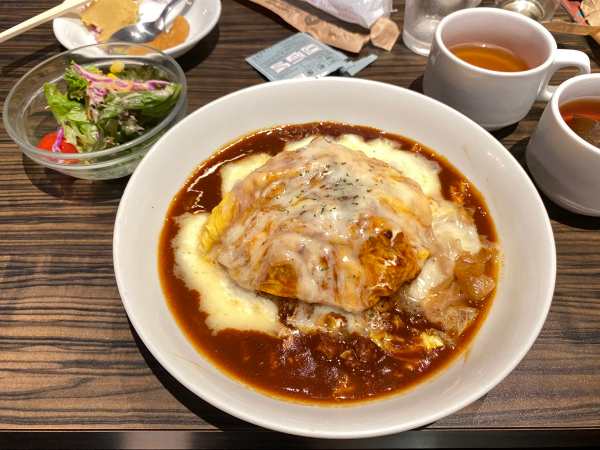 ランチセットのチョモランマオムライス。臭いチーズが乗っかっている。味は臭くなく美味しいが肉が沢山入っていてダメだった。ドリンクバーのグァバジュースがいける。