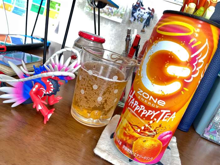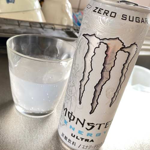 ポカリスエットとカルピスの中間みたいな味モンスターエナジー。カフェイン142mg入ってゼロカロリーゼロシュガー!こりゃいいや!半分注いでまた明日飲みます。