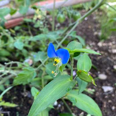 トマトの近くのツユクサ。トマトのための栄養を取られそうなので抜きました^^;