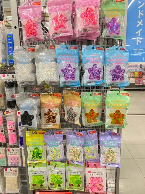 ダイソーのアイロンビーズ。パーラービーズとミニフューズビーズで間に合っているので買ったことはない。思ったよりカラー豊富でした。プレートも一枚100円。