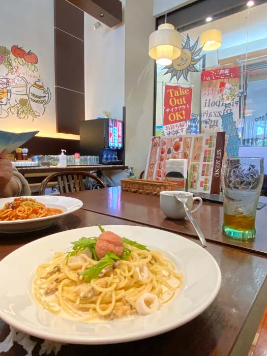 イオン苫小牧のカプリチョーザで、魚介たらこクリームパスタ。高いけど美味。