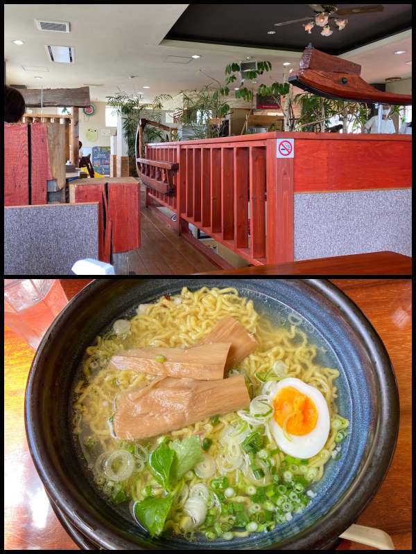 ラーメン屋「我夢舎楽」で塩ラーメン。(余分な具は家族に)水菜付き、ねぎだく、メンマ、半熟ゆで卵。わかめ味がしなく、さっぱりしてまた食べたいくらい良かった。店で食べる塩ラーメンはわかめ味が多い。
