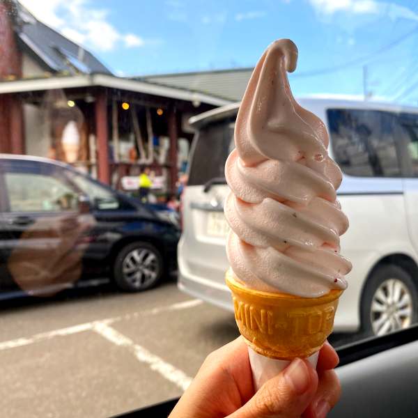 近くのあいチュらんどで季節限定とみられるいちごソフトクリーム。