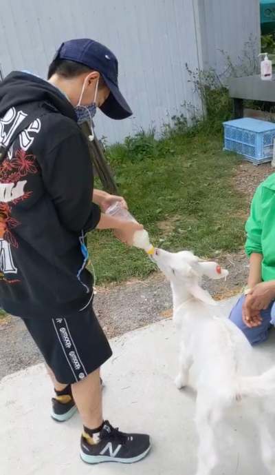 うれしそうに飛び跳ねて小屋から出てきては小さなしっぽをイヌのように激しくフリフリして勢いよく飲む。とっても可愛い。