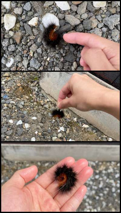 ヒトリガの幼虫、別名クマケムシ。触っても大丈夫。モサモサしてます。触ると丸まります。つまんで顔と腹脚も見ました。