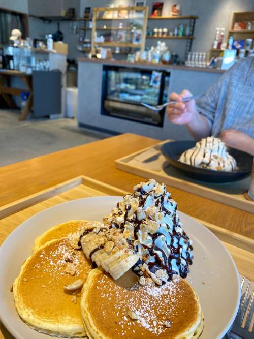 家で写真を確認したら撮影クオリティ低すぎて衝撃。室蘭ダイハツのカフェでチョコバナナナッツパンケーキ。ホイップクリームもっこりかと思ったら中にバニラアイス。パンケーキの食感はとくにふわふわではない。味はOK!