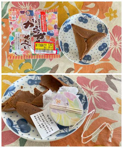 中に郷土玩具が入っているからからせんべい。なかなか地味なぶんぶんごまが入っていた。回してもぶんぶん鳴らない。なんだコレ!!!