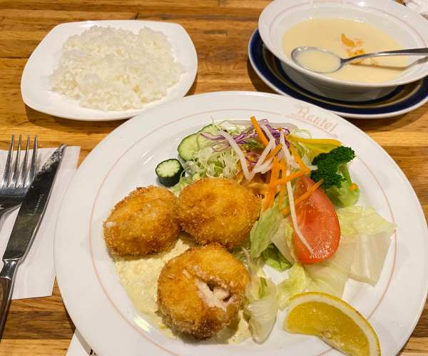 室蘭輪西「蘭亭」カニクリームコロッケ定食 1,200円。