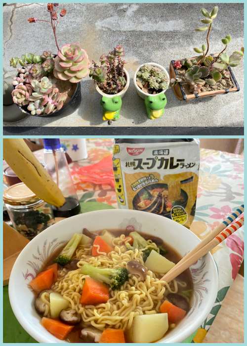 ごちそう、野菜たっぷりもっちりスープカレーラーメンを作る。水炒め6分+麺入れて4分茹でて一口サイズに切ったジャガイモは柔らかくなった。麺がもっちりしてマルちゃんより好みかな?
