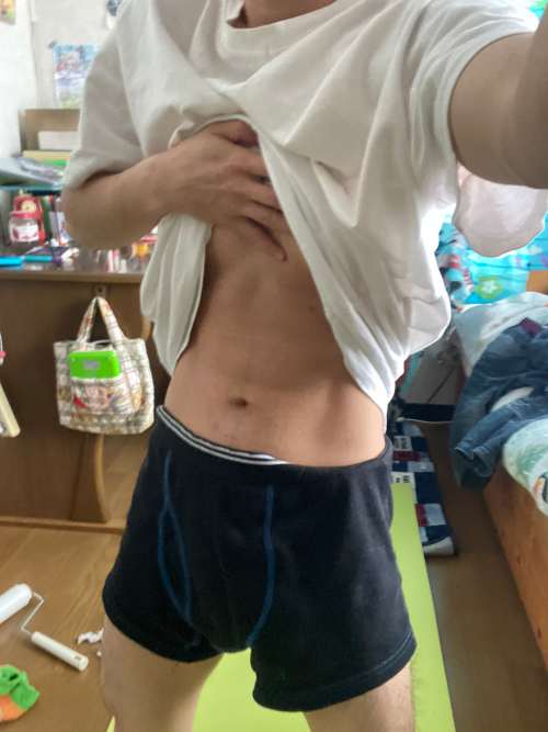 プリントTシャツをあたかも無地のように見せかけて後ろ前に着る…っと。周りが散らかって見えますが運動後だから。几帳面なのでいつもは綺麗です。
