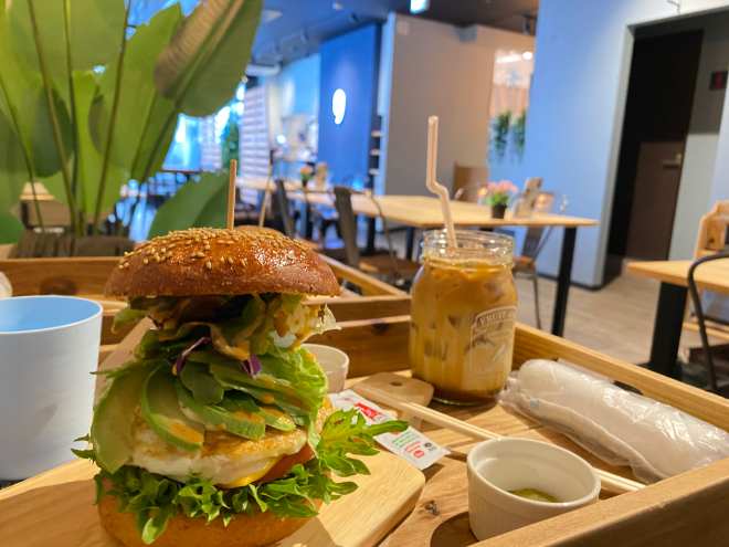 室蘭中島の満足して帰れるハンバーガーショップ、グレイトフルズ。2回目の今回はベジタリアンバーガーを。季節の野菜、アボカド、トマト、チーズ、エッグ、コブソース。ハンバーガーを食べる顔で食べました。