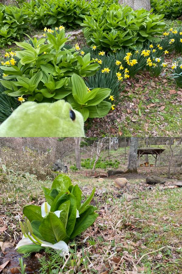 大きなミズバショウがいる。池の水が少なくなっていた。